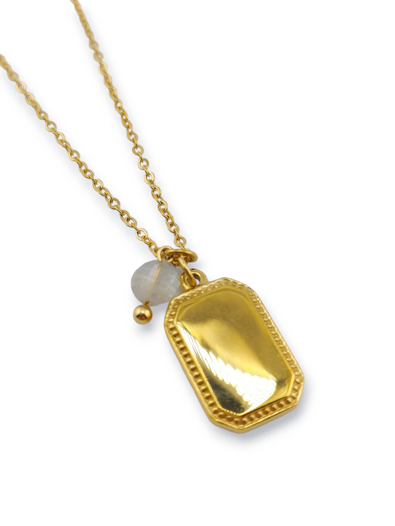 Collar de acero inoxidable, 40 cm, medalla y labradorita facetada, cierre de seguridad.
