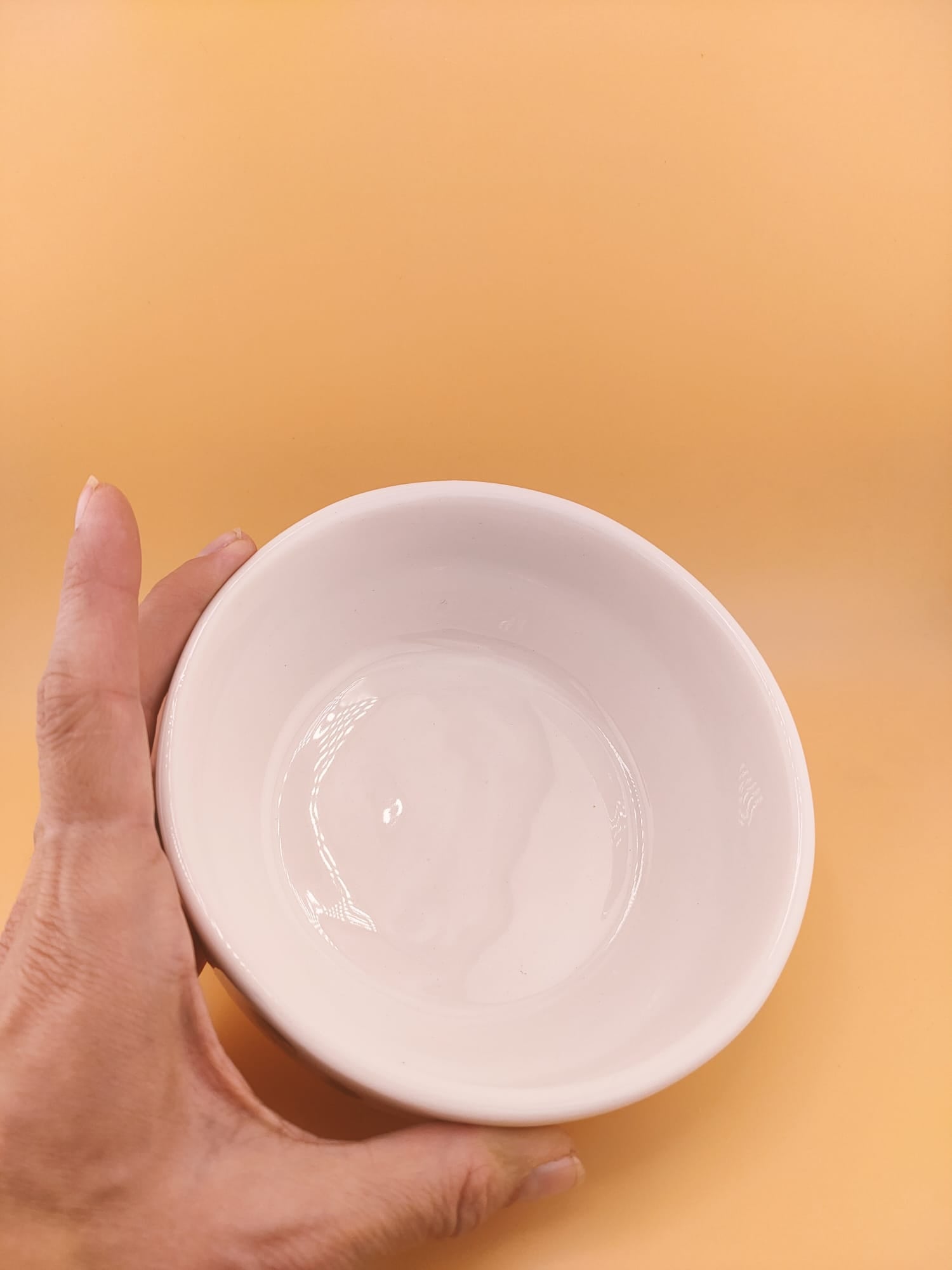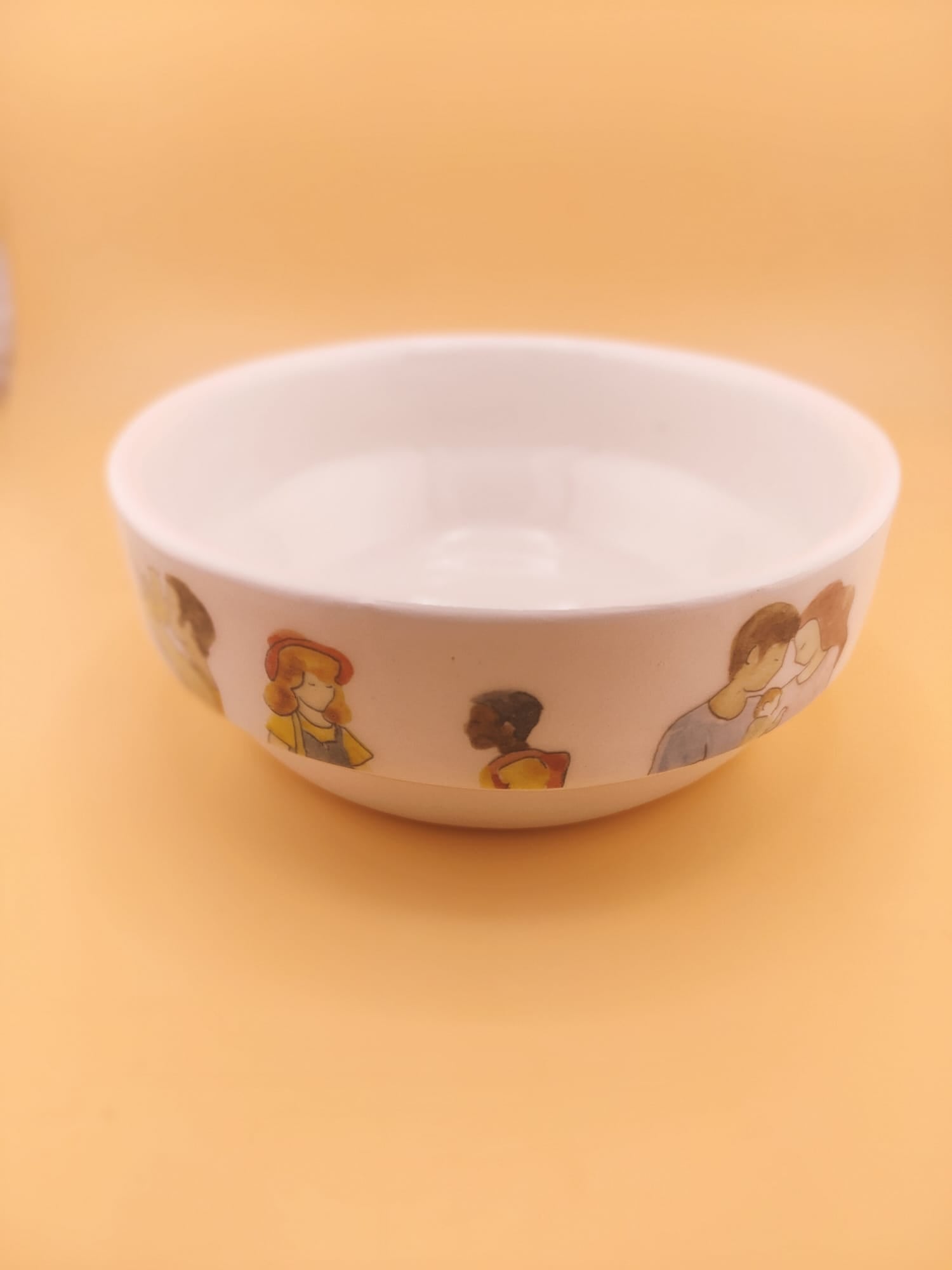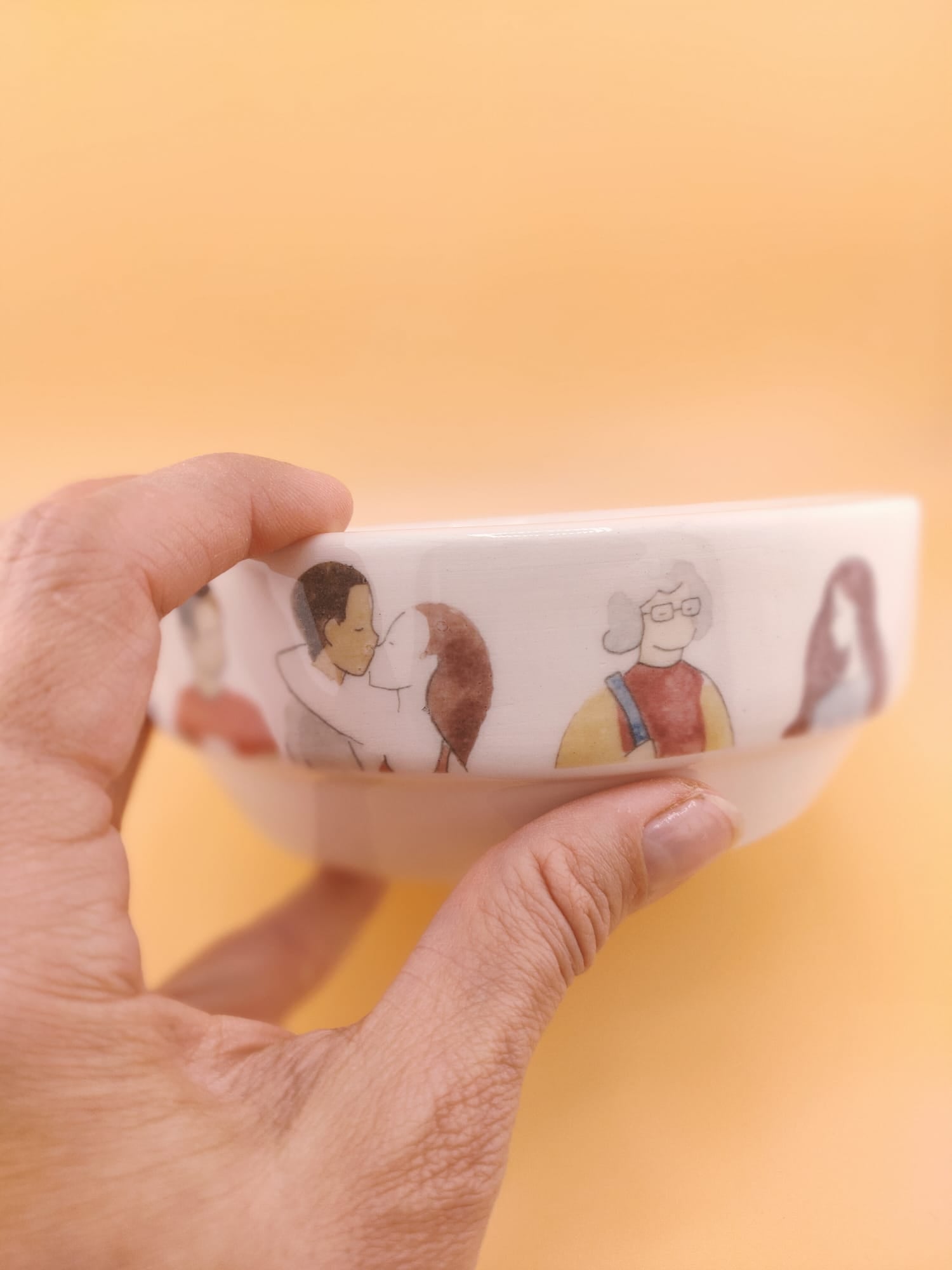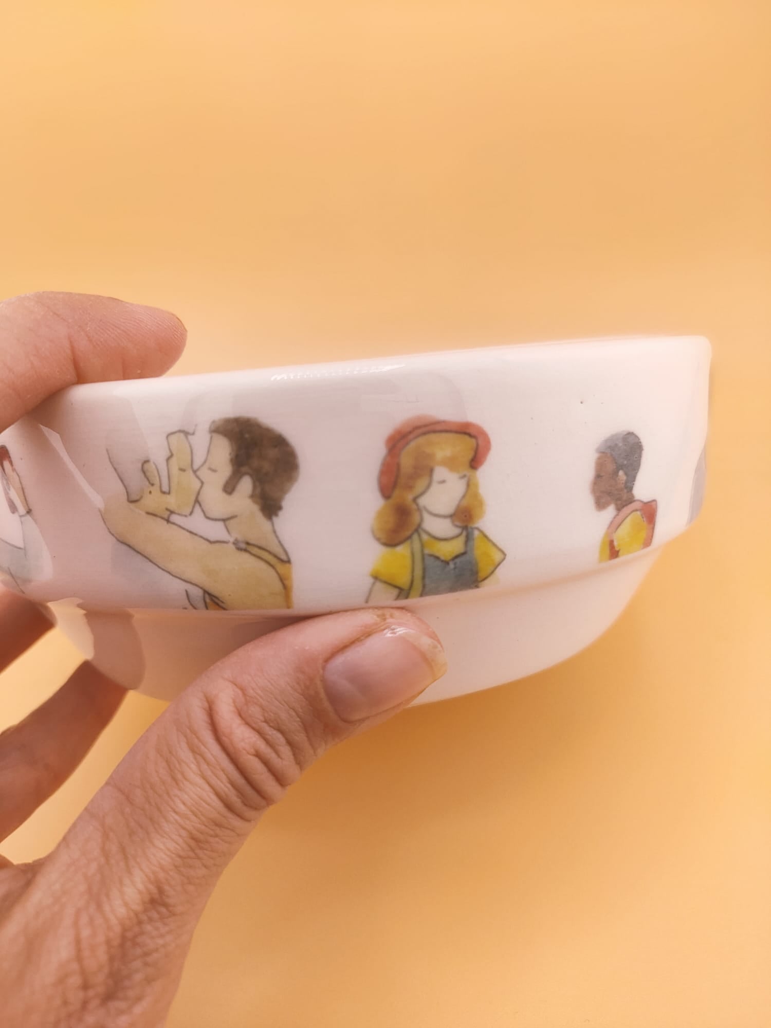 Cuenco de loza con ilustración hecha a mano utilizando la técnica de las calcas.
