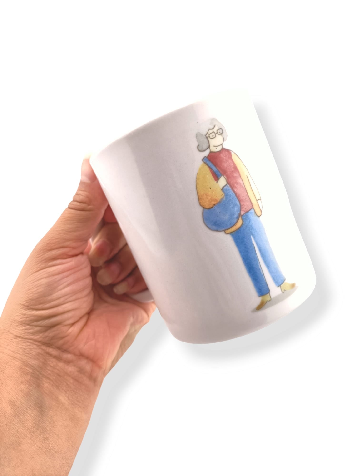 Taza de porcelana con ilustración hecha a mano utilizando la técnica de las calcas.
