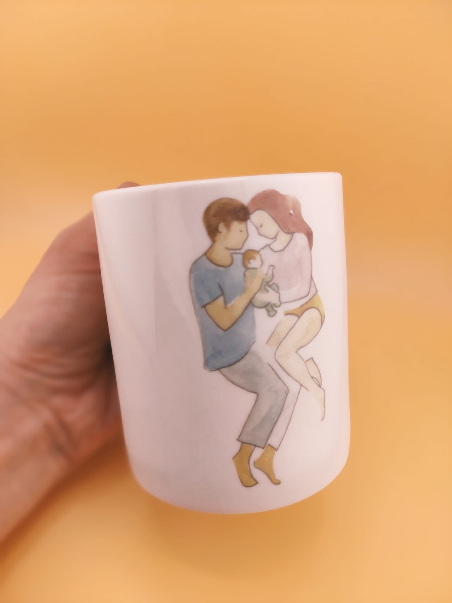 Taza de porcelana con ilustración hecha a mano utilizando la técnica de las calcas.