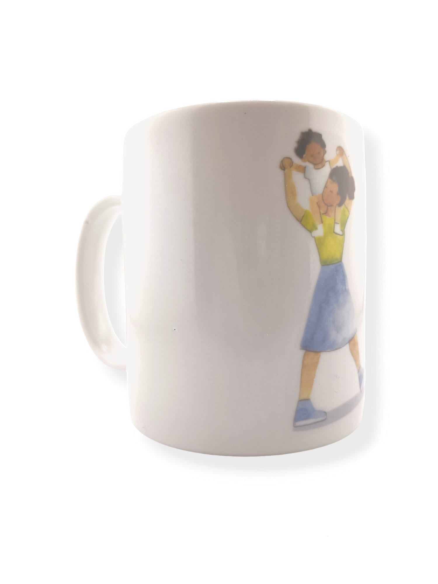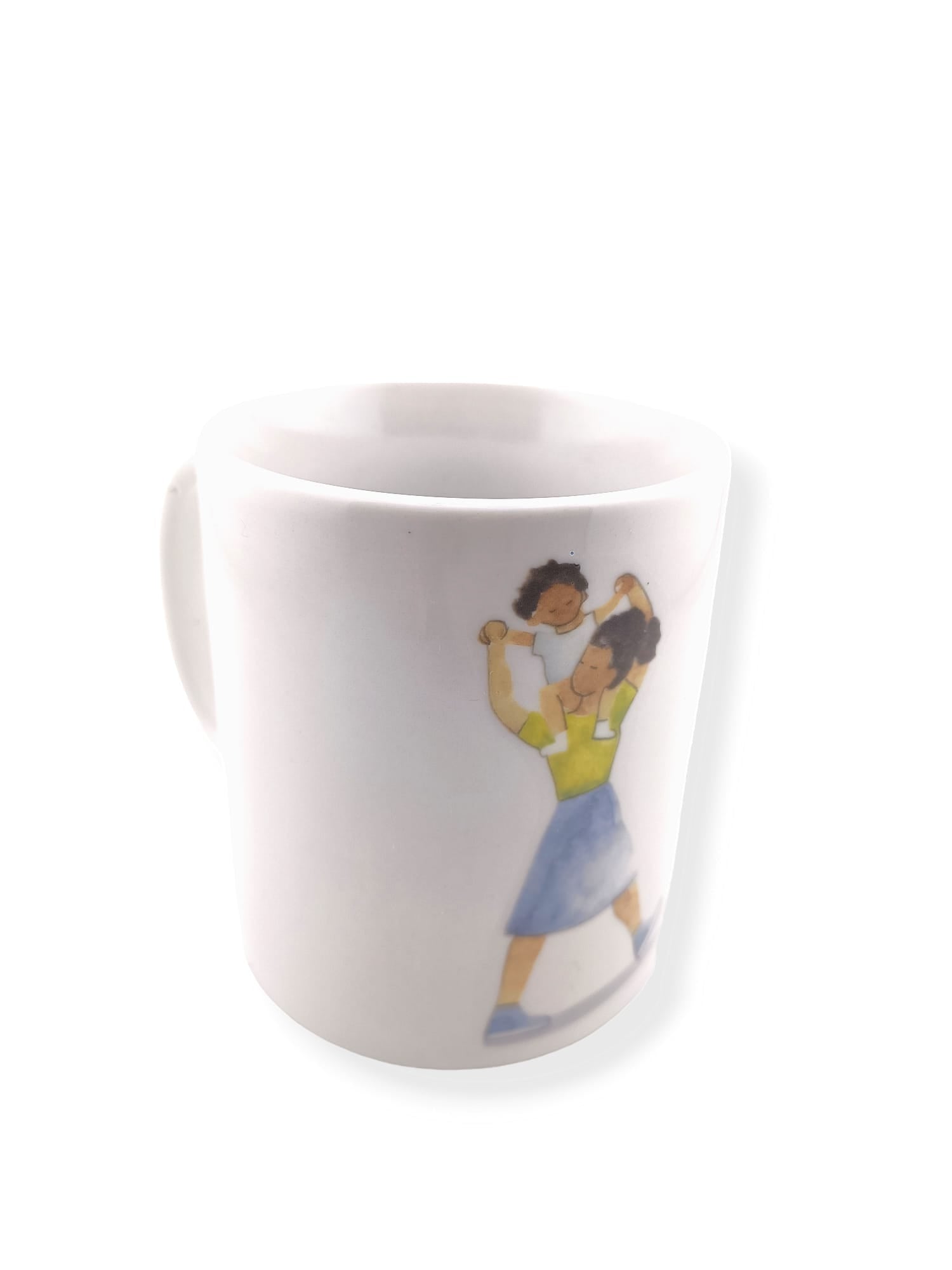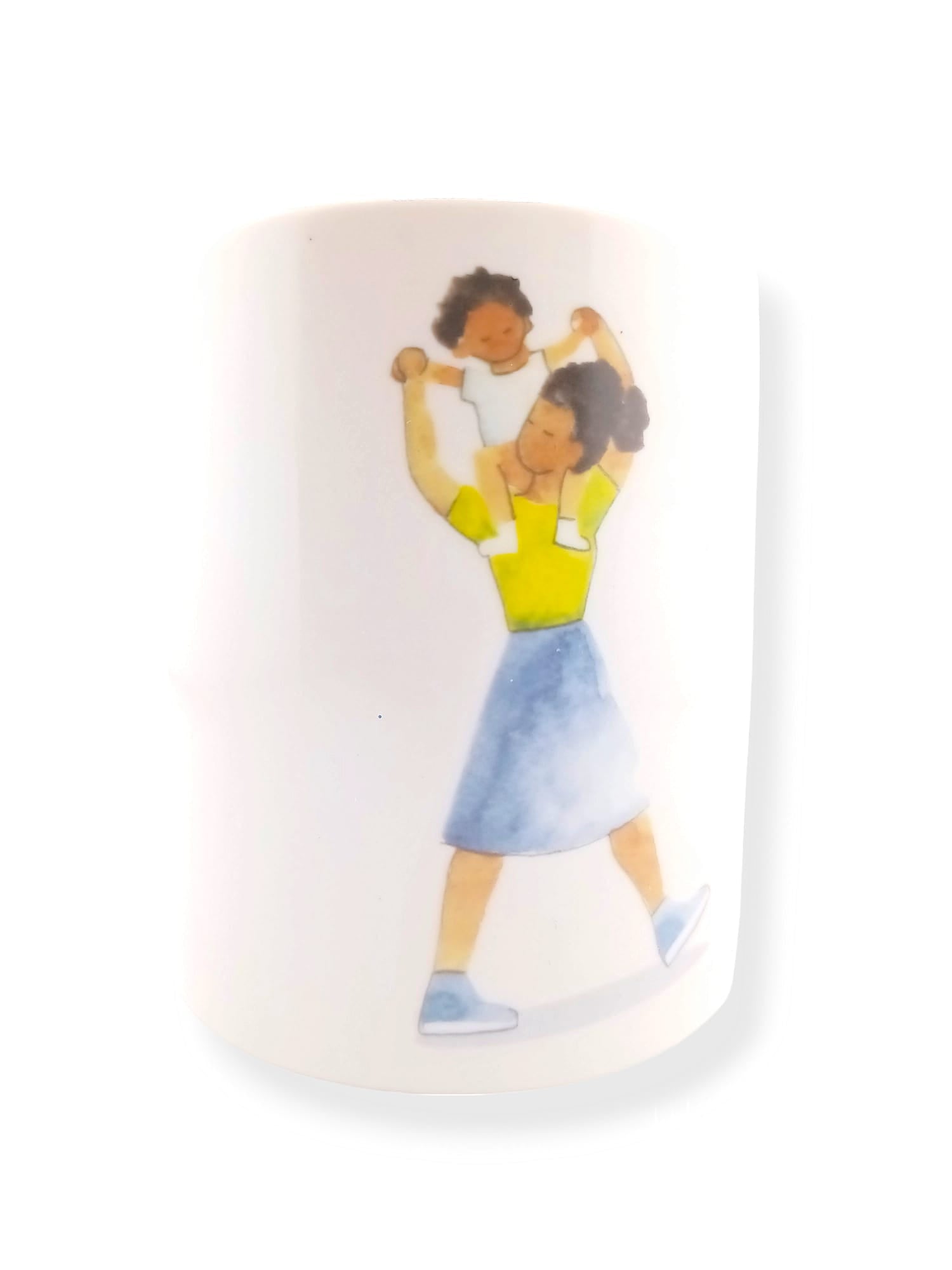 Taza de porcelana con ilustración hecha a mano utilizando la técnica de las calcas.
