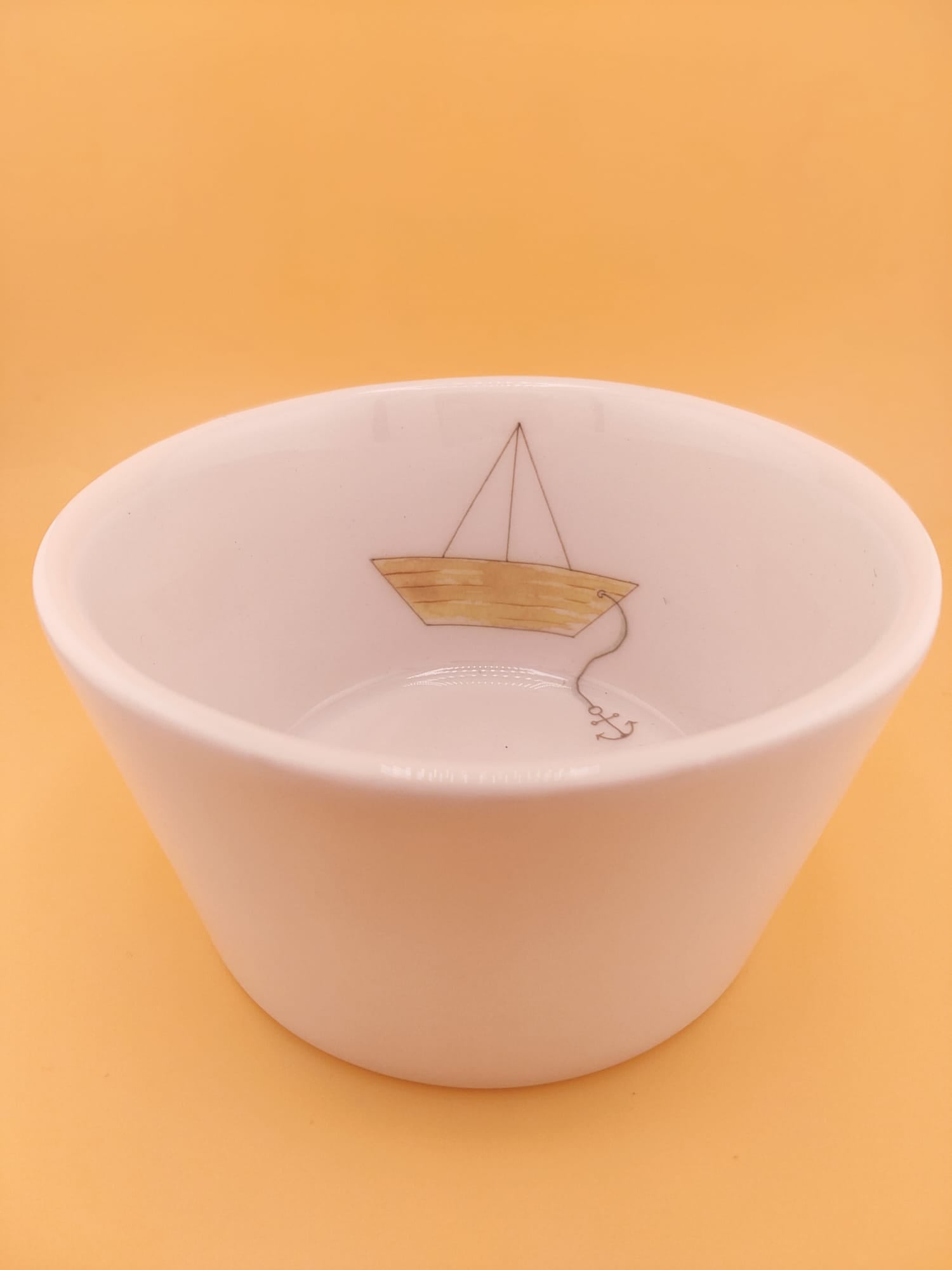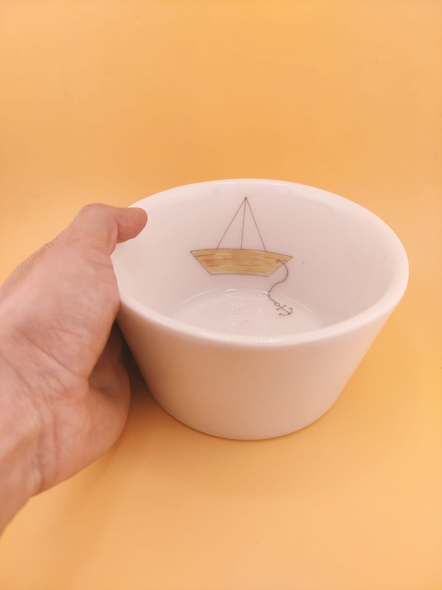 Taza de loza con ilustración hecha a mano utilizando la técnica de las calcas.