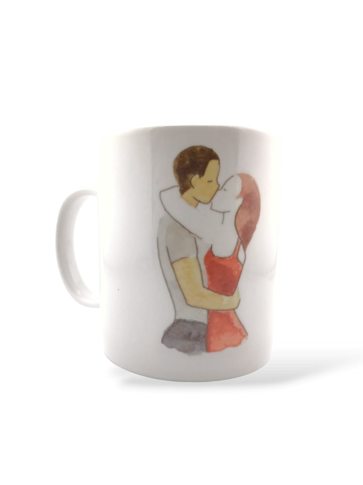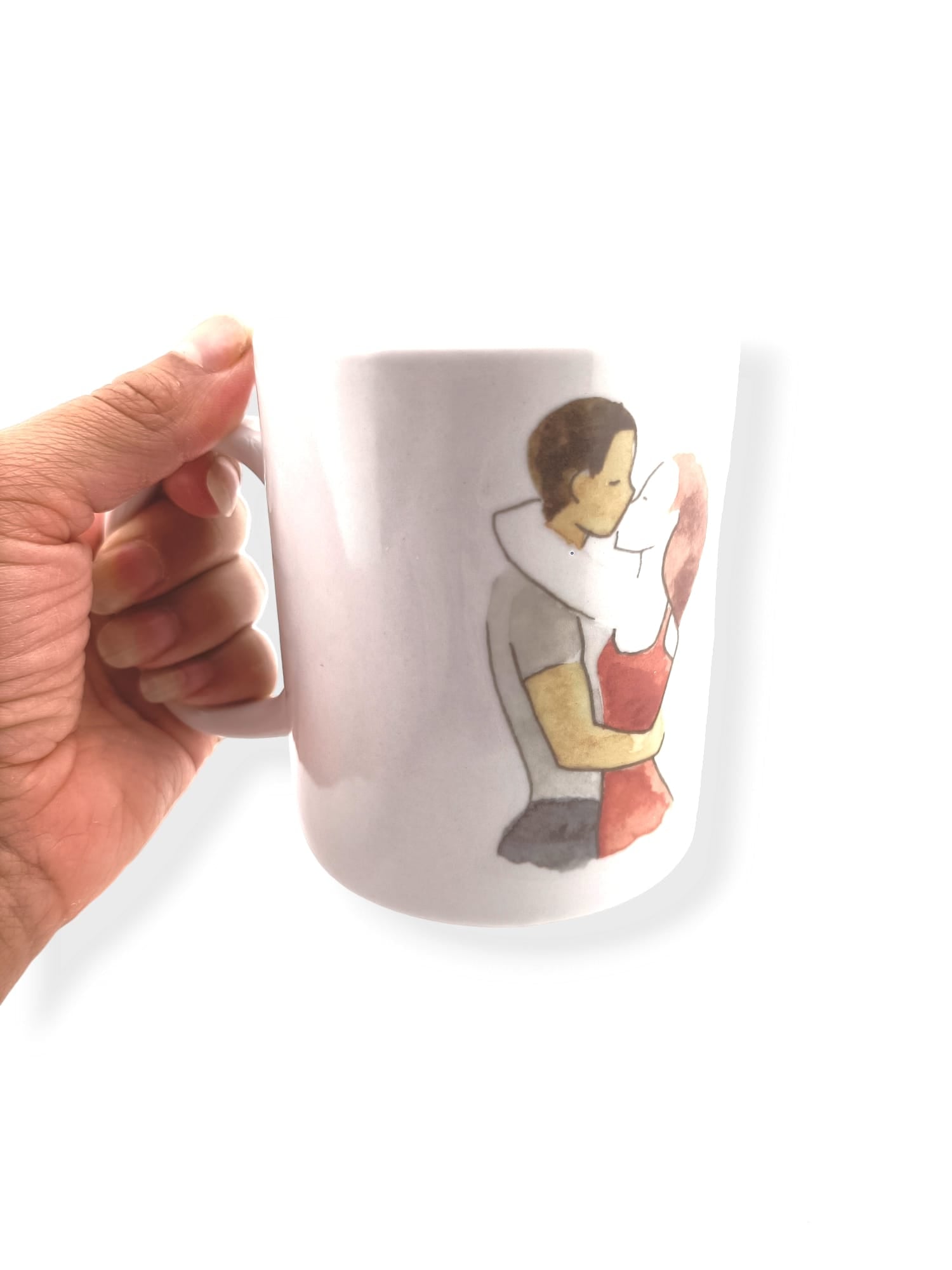 Taza de porcelana con ilustración hecha a mano utilizando la técnica de las calcas.